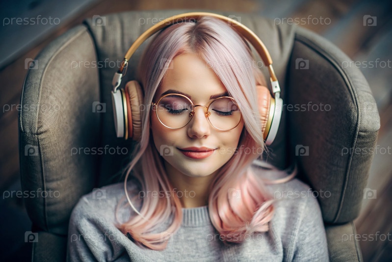 Молодая красивая девушка с розовыми волосами слушает музыку в больших беспроводных наушниках дома, на стуле в гостиной
