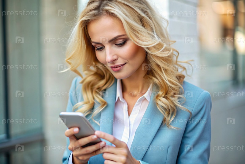 Блондинка-бизнесменка с кудрявыми волосами, она одета в обычное голубое пиджак. В руках у нее смартфон. Бизнесмен смотрит на свой мобильный телефон