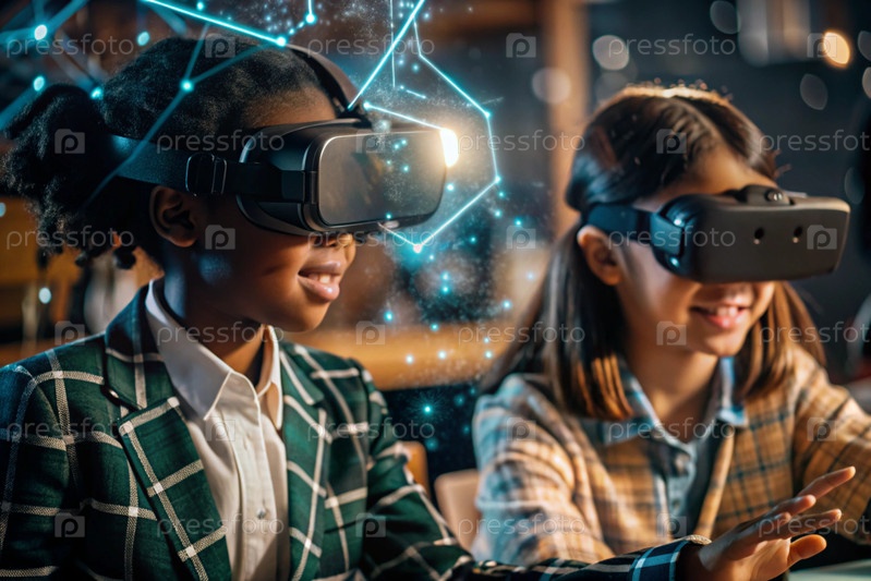 Чернокожая африканская девушка с очками виртуальной реальности.Ребенок находится в классе, а другие ученики на заднем плане.Цифровой интерфейс отображается в наушниках