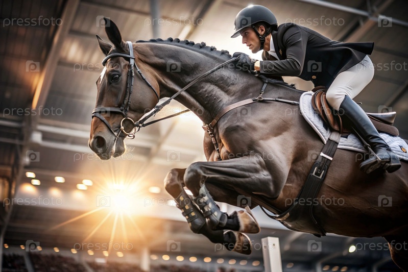 Близкий план олимпийской лошади и всадника, перепрыгивающих через препятствие на открытой арене - это конная езда