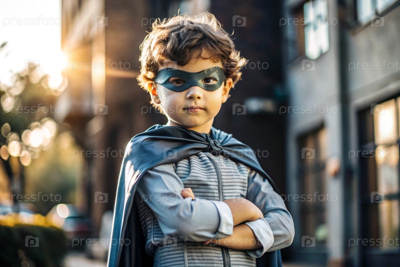 Маленький мальчик в костюме супергероя на улице ребенок со сверхспособностями герой костюмированная вечеринка