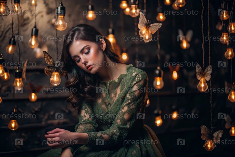 Портрет красивой девушки в зеленом платье среди многих подвешенных лампочек и бабочек, размахивающих вокруг нее