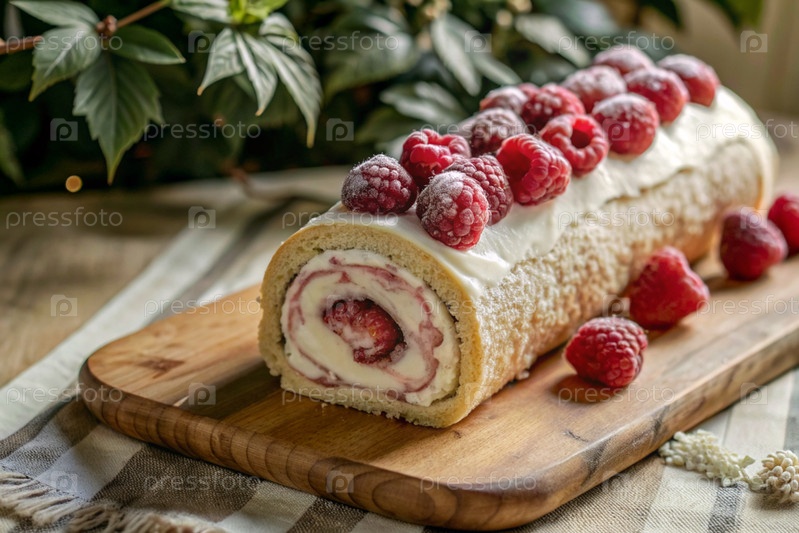 Швейцарская губка с малиной, вкусный фруктовый и сливочный десерт наполненный кремовым сыром, украшенный свежими малинами