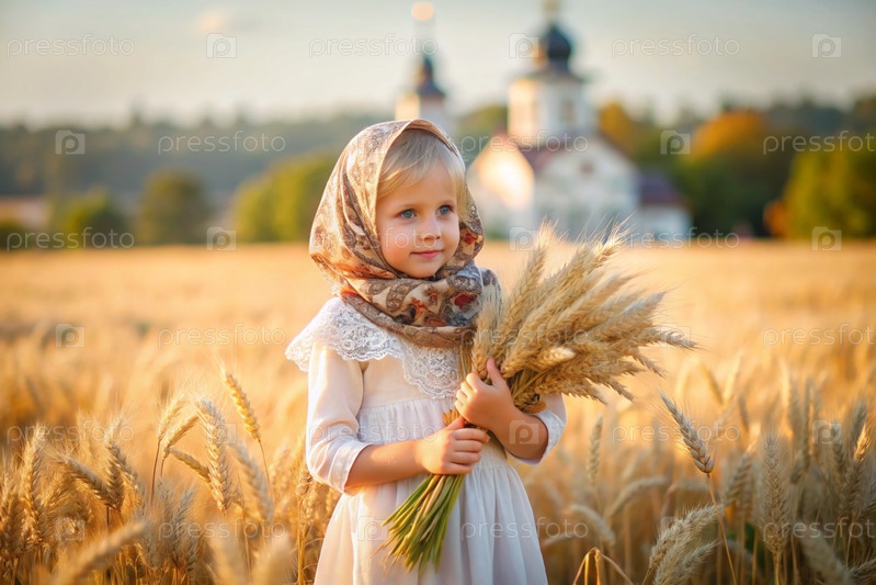 Русская девушка в белом платье и русском полотенце держит золотые колосья пшеницы на фоне созревающего поля и православной церкви