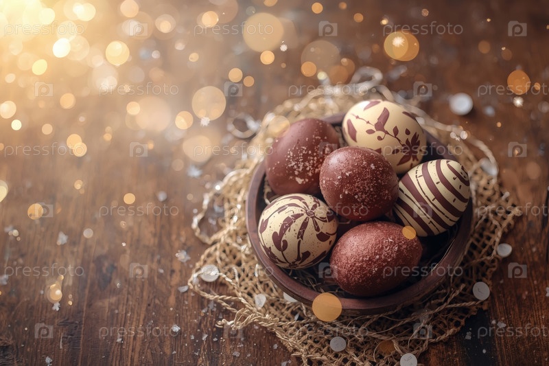 Концепция ярких пасхальных праздников в 2026 году. Хорошая открытка. Баннер. Шоколадные пасхальные яйца на деревянном фоне. Пасхальные сладости и лакомства