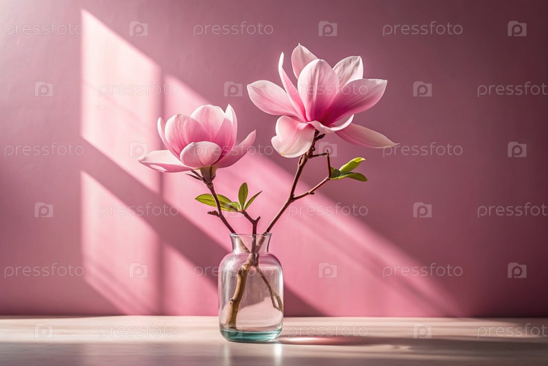 Элегантная магнолия цветет на ветке в стеклянной вазе на розовом фоне с контрастным солнечным светом. Нежные цветки с розовыми оттенками. деревенская ветка
