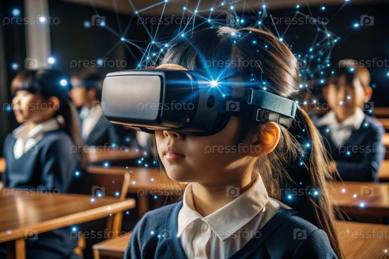 Азиатская девушка с очками виртуальной реальности.Ребенок находится в классе, а другие ученики на заднем плане.Цифровой интерфейс отображается в наушниках