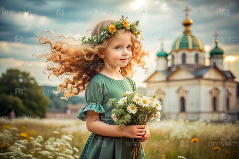 Всероссийский День семьи, любви и верности Красивая маленькая кудрявая девочка с букетом ромашек на фоне Православной церкви День святого Валентина Петра и Февронии