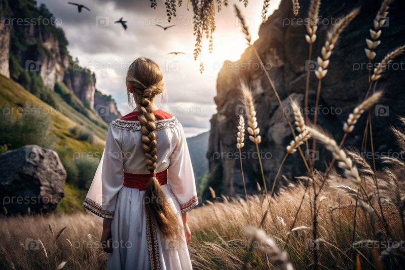 Девушка в традиционном русском льняном наряде и с сковородой на голове на поле спелой золотистой пшеницы на фоне березы и православной церкви