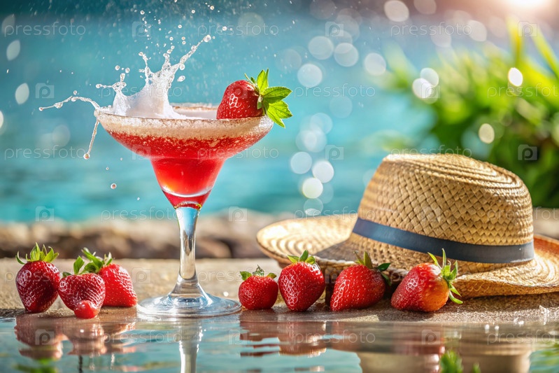 Стакан вкусной клубничной маргариты и клубничный коктейль на фоне бассейна. алкогольный коктейль сочного фруктового синего цвета с кубиками льда, ягодами и мятой