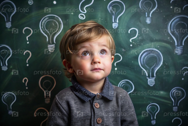 Развитие и образование детей. вдумчивый мальчик на темном фоне с лампочкой и вопросительными знаками. мозговой штурм и концепция идеи