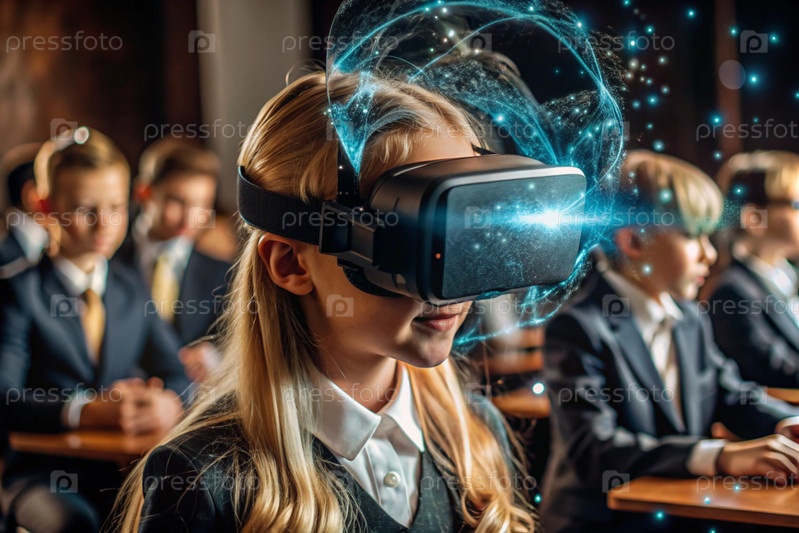 Девочка с очками виртуальной реальности. Ребенок находится в классе, а другие ученики на заднем плане. Цифровой интерфейс отображается в наушниках