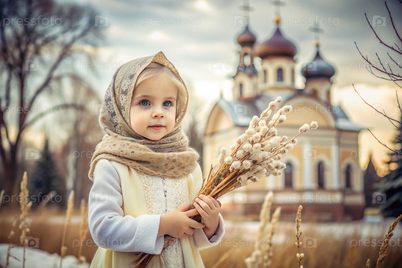 Пальмовое воскресенье. христианство. портрет трехлетней девочки в русском народном шале с ветвями ивы в руках на фоне православной церкви