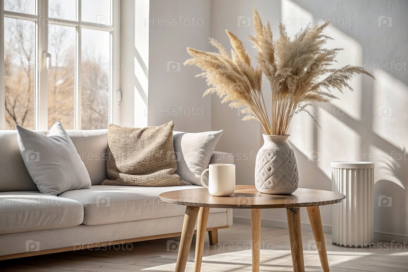 Современная белая керамическая ваза с сухой травой на деревянном столе Скандинавский интерьер Пустая белая стена со тенью из окна