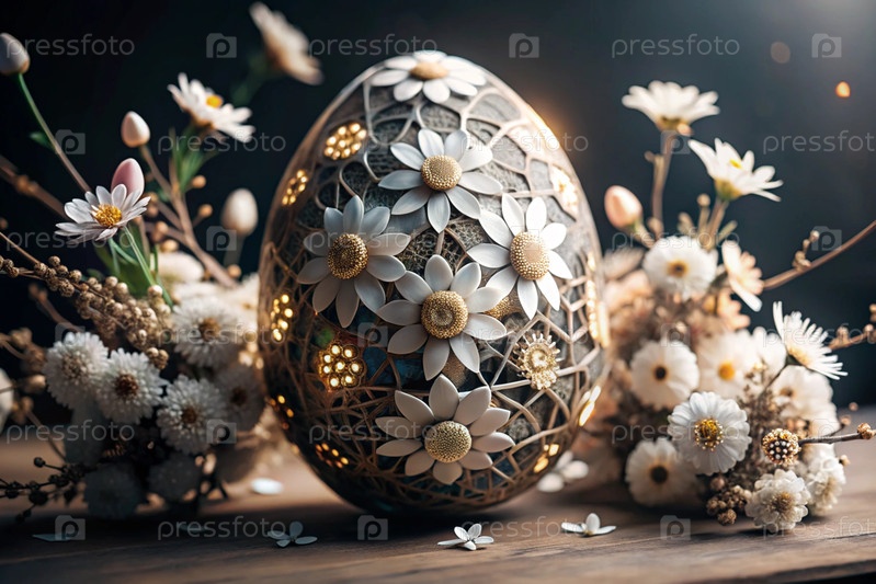 Пасхальный баннер. Концепция яркого пасхального праздника. Необычное деликатное пасхальное яйцо с нежными белыми цветами