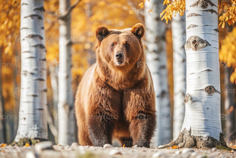 Большой коричневый медведь против березовой рощи.Охота на животных.Браконьерство