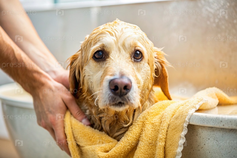 Золотой ретривер купается в пузырьковой ванне. Помыть собаку. Концепция ухода за домашними животными