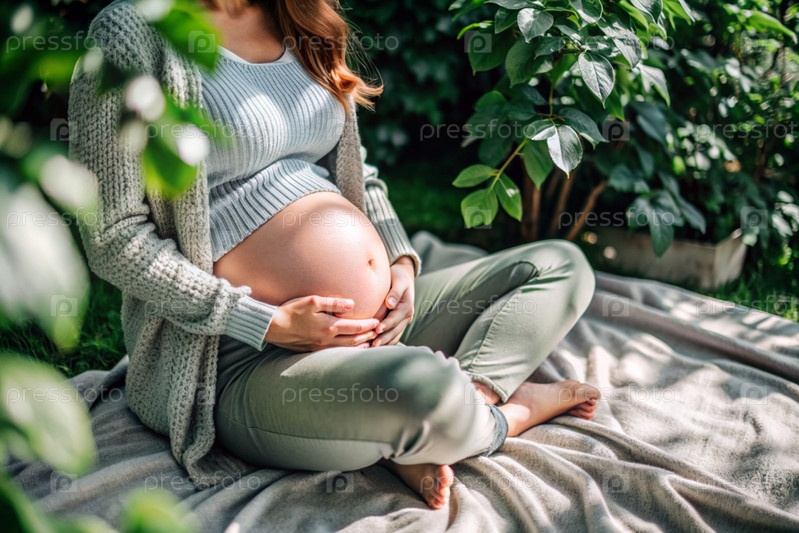 Молодая беременная женщина держит свой живот на фоне сада во дворе дома. Близко. Женщина готовится стать матерью. Беременность и роды