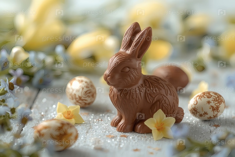Шоколадное пасхальное яйцо, шоколадный кролик и весенние цветы на деревянном фоне. Пасхальные сладости и лакомства. Концепция яркого праздника Пасхи в 2026 году. Хорошая открытка