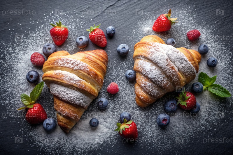 Вкусные свежевыпеченные кроассанты и ягоды в форме сердца на тёмном фоне сланцевого камня. французский завтрак. хорошие ближневые выпечки. пекарня со вкусным хлебом. кондитерские изделия