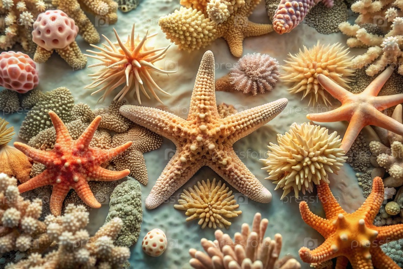 Концепция летних каникул. Подводный мир. Кораллы и морские звезды под водой. Красивый абстрактный фон для баннера