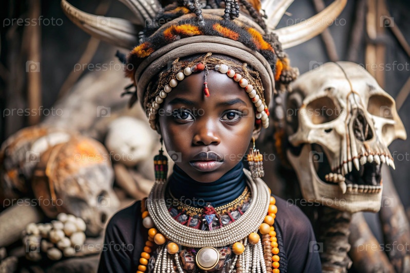 Красивая африканская девушка в традиционном национальном костюме. с костями. портрет символизирует традиции, культуру и красоту африканского народа