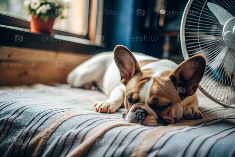 Уставший щенк Бульдог спит перед фанатами в спальне в очень жаркий летний день