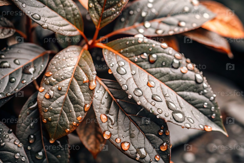 Макрографический крупный план красно-зеленых листьев, капли воды на листьях