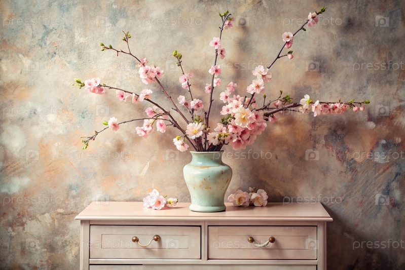 Красивая ветвь розовой вишни в стеклянной вазе и флаконы на древнем деревянном шкафу. Букет цветов в вазе во внутренней части дома. Светлый, бежевый, розовый цветочный фон