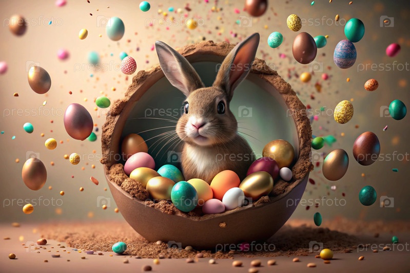 Известный праздник. милый пасхальный кролик заглядывает из ямы с красочными яйцами вокруг. концепция счастливой Пасхи