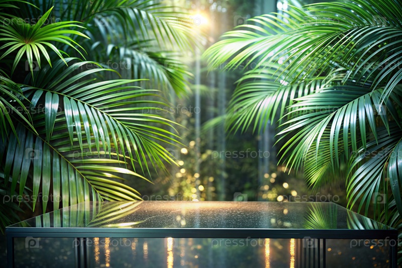 Минимальный фон для демонстрации продукта.Современная стеклянная трибуна со стеной из стекла и пальмовых листьев.Элегантный дизайн для презентации продукции