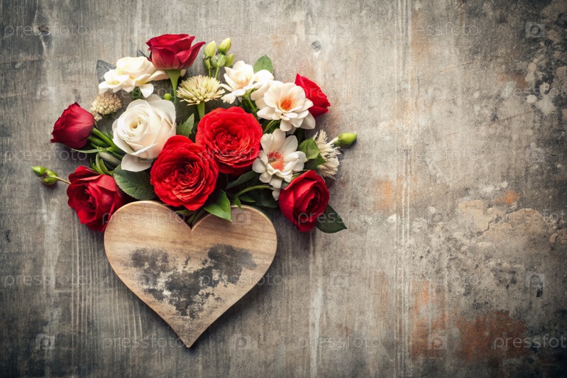 Открытка, баннер Дня матери с красными цветами, сердца на винтажном сером деревянном фоне
