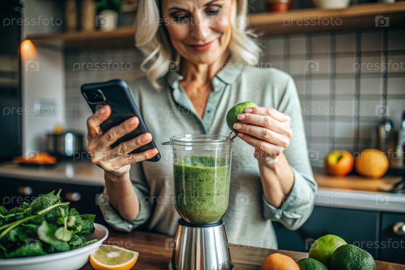 Пожилая женщина на кухне смотрит на рецепты здоровой пищи по телефону и готовит овощный коктейль из брокколи в блендере