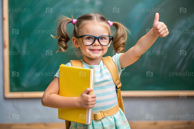 Красивая девушка в очках показывает класс своей рукой. Ребенок идет в школу впервые. Ребёнок с школьной сумкой и книгой. Ребенок в классе со доской на заднем плане. Назад в школу
