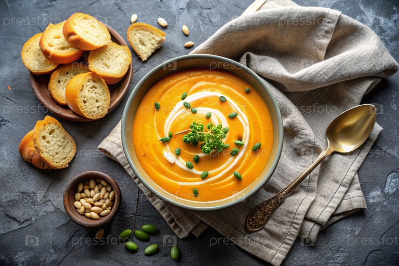 Традиционный мягкий тыквенный кремовый суп с сливками и семьями тыквы на черном бетонном фоне