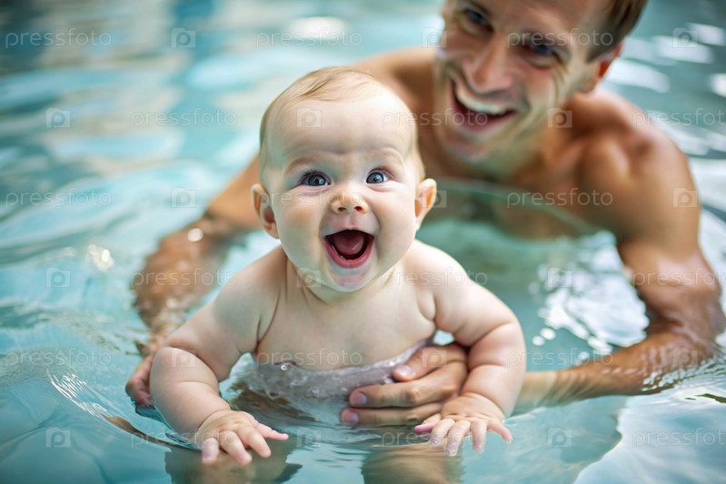 Детское плавание. Ребенок плывет в бассейне с тренером. Счастливый и улыбающийся ребенок. Руки тренера держат ребенка. Занятия раннего развития для детей