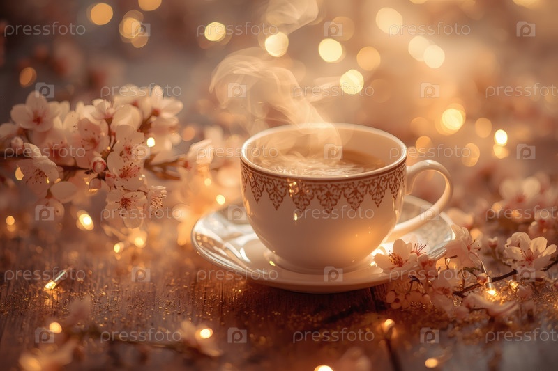 Нежные розовые вишневые ветви и чашка горячего чая на деревянном фоне. аромат