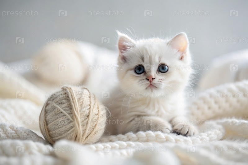 Животные. маленький пушистый белый котенок играет с шариком пряжи на белой кровати. любопытный кот лежит на белом одеяле и смотрит в камеру. текстиль, вязание