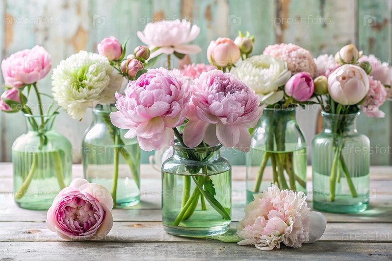 Красивые белые и розовые пионы в стеклянных вазах на деревянном столе. Цветы и почки в вазе. Светлый, белый, розово-зеленый цветочный фон