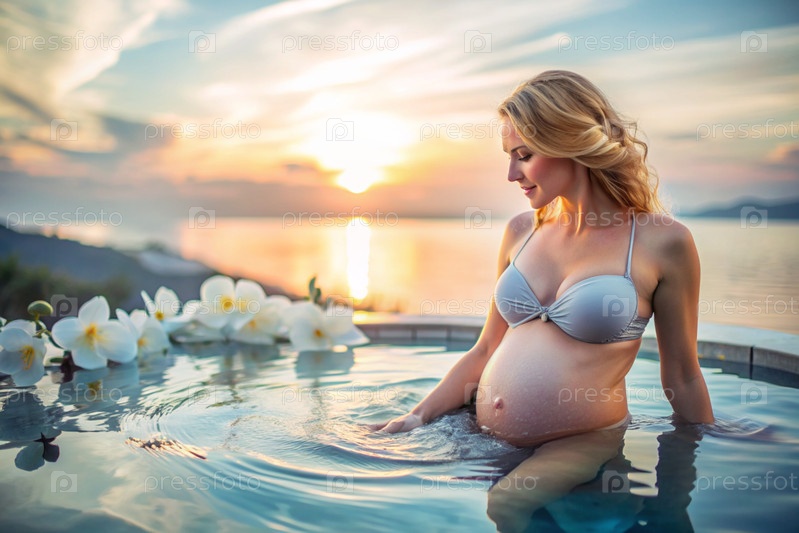 Расслабление, душевное спокойствие. Беременная красивая женщина в отопительном бассейне на открытом воздухе. Понятие беременности, родов и родительства. Здоровый образ жизни