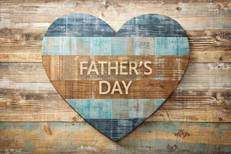 Стильная открытка, баннер на День счастливого отца с деревянным сердцем на винтажном сером, синем и коричневом деревянном фоне