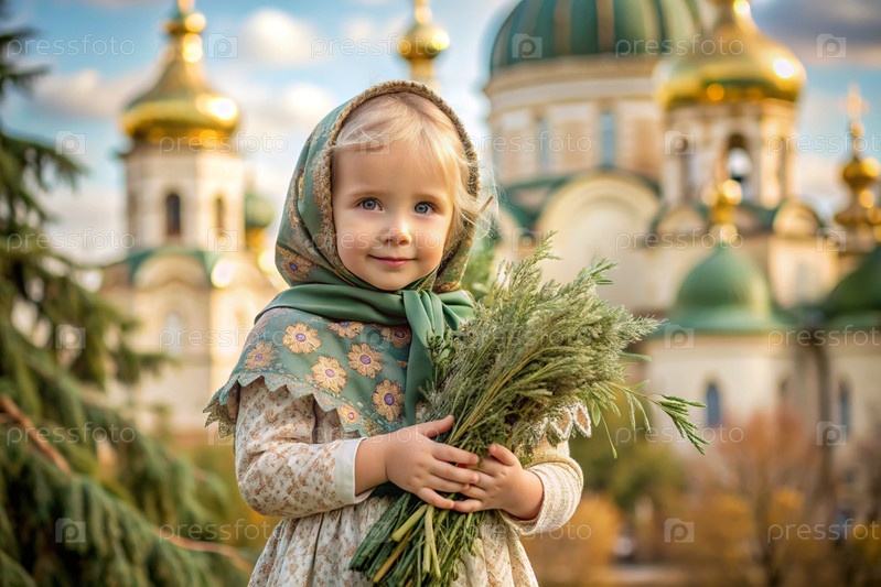 Портрет трехлетней девочки в русском народном шале с букетом дикой травы в руках на фоне православной церкви