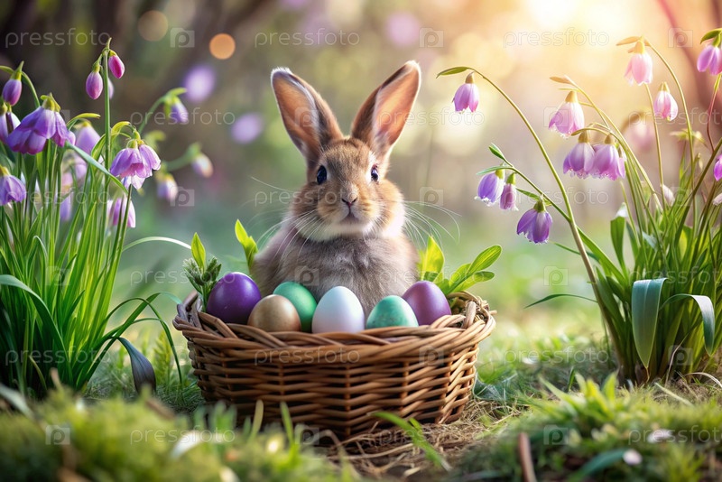 Баннер. пасхальный кролик в корзине из красочных пасхальных яиц вокруг весенних снегопадов и первичной розы. концепция праздника Пасхи