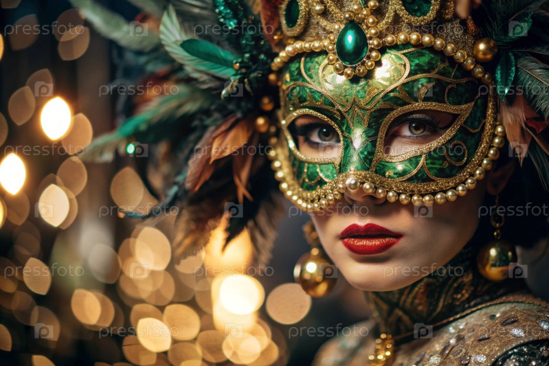 Карнавал Венеции.Закрытие женщины в украшенной карнавальной маске.Яркие цвета передают атмосферу празднования и роскоши