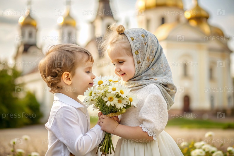 Всероссийский день семьи, любви, верности. милый мальчик и девочка с букетом ромашек на фоне православной церкви. День святого Валентина Петра и Февронии. религия, христианство