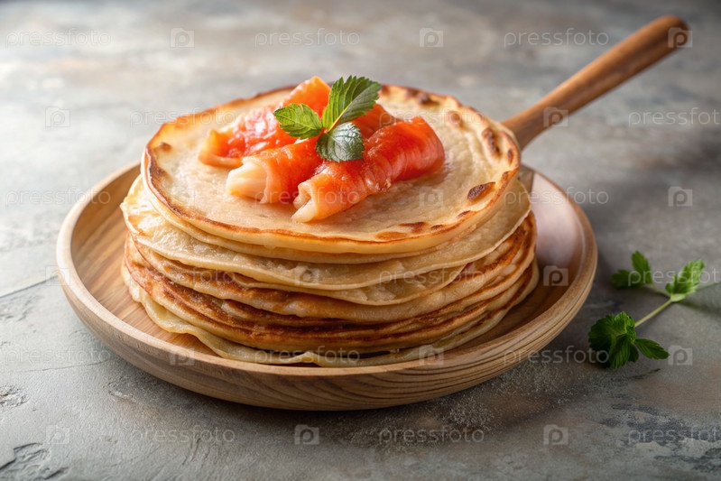 Вкусные блины с соленой красной рыбой.Концепция российского праздника Масленицы