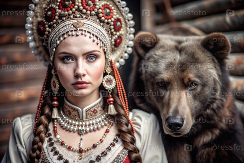 Красивая девушка в традиционном русском национальном костюме.Перед живым медведем.Портрет символизирует традиции и красоту русского народа