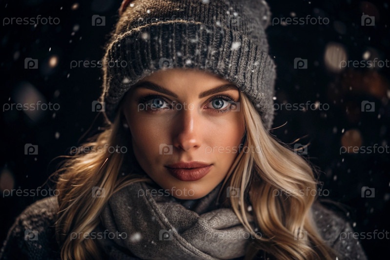 Зимний портрет: блондинка с ярко выраженными голубыми глазами в вязанной шляпе, шарфе и свитере