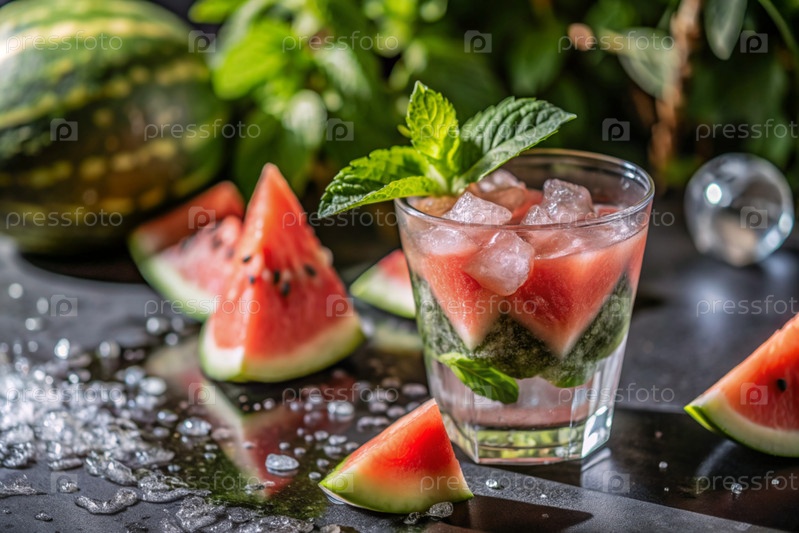 Свежий вкусный арбузный лимонад, мята, кубики льда и кусочки арбуза. летний освежающий напиток