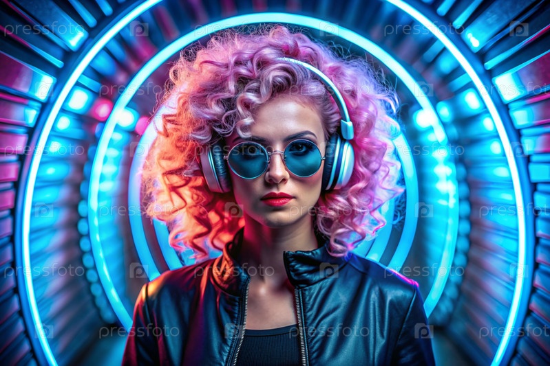Молодая красивая девушка в солнцезащитных очках слушает музыку на больших беспроводных наушниках, стоя в неонном туннеле среди неоновых вывесок